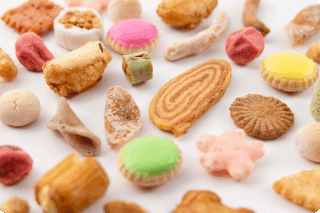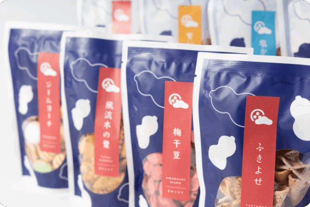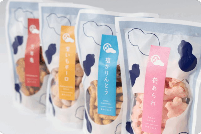 六瓢箪をイメージしたパッケージが印象的で、通年商品としては12種類以上をランナップしています。それ以外に、春・夏・秋・冬とその季節にあった限定商品を展開しており、合計すると25種類以上のラインナップとなります。あられ・かりんとう・豆菓子・せんべいなど種類も豊富で、全種類を並べると圧巻です。