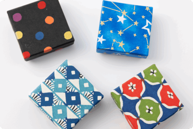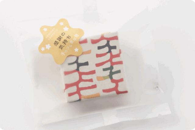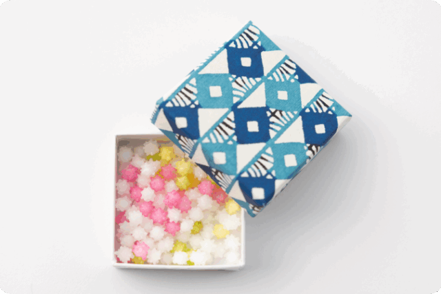 手のひらにのる、かわいい和紙の小箱からは、キラキラお星さまのような金平糖が入っています。外袋には「感謝のきもち」のメッセージシールが付き、プチギフトとしておすすめです。和紙は京菓堂の企画者が、京都の和紙屋さんで一枚一枚時間をかけて選んだものを使っています。