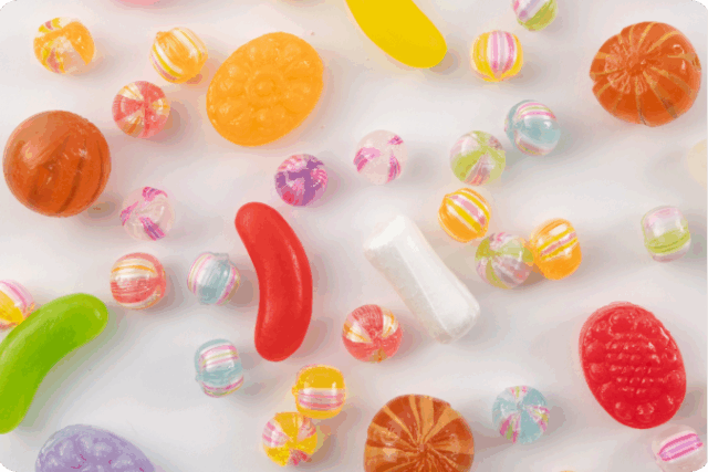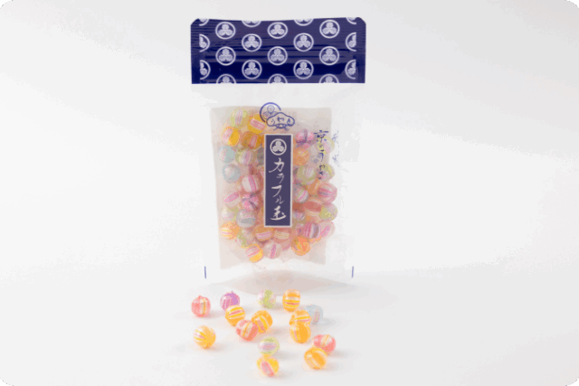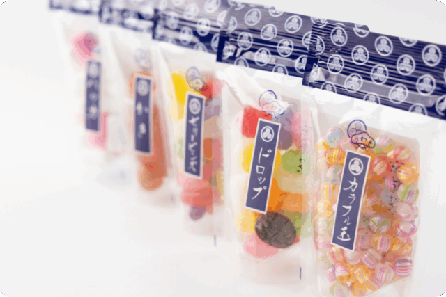 チャック付きの持ち歩きやすいパッケージはシンプルで、中の飴もキレイに見えるところが特徴です。 通年商品9種類をランナップしており、それ以外に、春は桜、夏はすいか、秋は栗、冬はみかんなど、その季節にあった限定商品も展開しております。カラフルな色合いの飴を中心に、金平糖やラムネなど種類も豊富です。